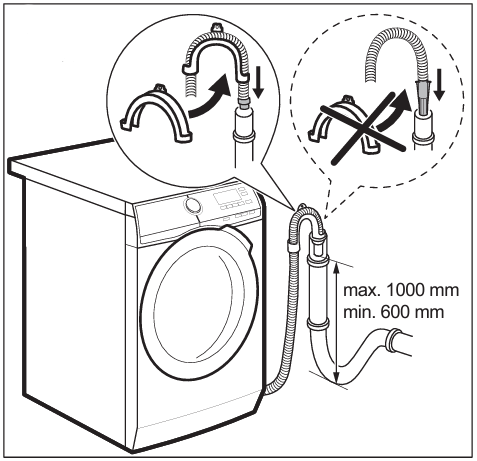 - Furtunul de scurgere nu trebuie să se prelungească în scurgere mai mult de 10 cm.