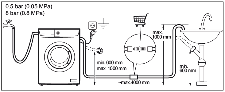 - Înălţimea scurgerii nu trebuie să depăşească 100 cm şi să nu fie sub 60 cm peste baza maşinii sau aşa cum se indică în manualul de utilizare.